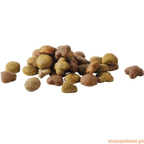 Carne e derivados animais (frango 12%), cereais (arroz 4%), derivados de origem vegetal, legumes (ervilhas 4%, cenouras 0,5%, tomates 0,5% e brócolos 0,5%), óleos e gorduras, sementes, minerais, leveduras , fruta (maçã 0,5%)