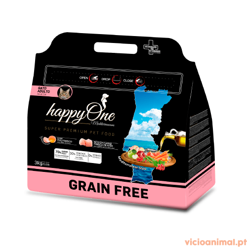 happyOne Mediterraneum Cat – Alimento super premium para gatos adultos com 70% de carne, 30% de fruta e vegetais e 0% de cereais. Rico em carne fresca de aves (para mais apetência); com ovo fresco (mais digestível) e enriquecido com antioxidantes naturais (para maior protecção).