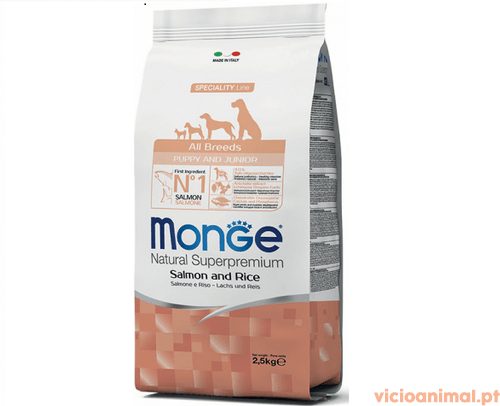 Monge Natural Superpremium Speciality Line Puppy & Junior com Salmão e Arroz é um alimento completo para os cachorros de todas as raças. Este alimento garante o bem-estar do seu animal, graças à elevada qualidade dos nutrientes, produtos altamente palatáveis com a garantia única de proteína: apenas um tipo de carne. Tendo como principal ingrediente o Salmão é também enriquecido com XOS (Xilo-oligossacarídeos), a última geração de prebióticos que mantêm o bem-estar intestinal. Contém extrato de alcachofra, equinácea, orégão e alho que estimulam o sistema imunológico e protegem o fígado. Condroitina, glucosamina, cálcio e fósforo que ajudam nas articulações e no correto desenvolvimento muscular.