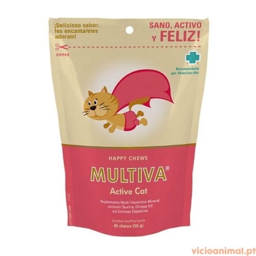 Multiva Active Cat é um alimento complementar dietético em forma de snack de alta palatabilidade, ajuda a combater a muda excessiva, manutenção da pele e do pêlo, indicado para animais apáticos, inapetentes ou deprimidos (com Vit B1 para estimular o apetite), estados de carência (convalescença, recuperação, pós-cirurgia…), aumento das necessidades nutricionais (fêmeas gestantes e lactantes) e animais em crescimento.