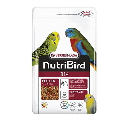 Nutribird B 14 é uma ração de manutenção completa e equilibrada para periquitos pequenos e outros psitacídeos. Também indicada para agapornis, neophemas e forpus. Nutribird B 14 são granulados com uma composição cientificamente justificada à base de cereais seleccionados, fruta fresca e 50 % de milho-alvo. Completamente absorvível, sem perdas. Contem Florastimul, uma substância que suporta a flora intestinal e protege contra distúrbios intestinais. Caso o seu pássaro não esteja habituado à alimentação em granulados, a transição para esta nova alimentação deverá ser gradual.