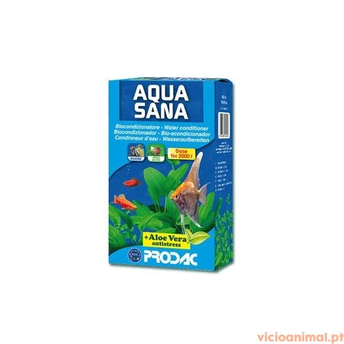 Esta formula está enriquecida com ALOE VERA, um colóide especial natural que protege a mucosa da pele e as guelras dos mesmos. AQUASANA deve ser usado logo que o seu novo aquário seja cheio pela primeira vez, ou quando das mudanças de água, uma vez que além da protecção já referida, também tem a particularidade de manter o pH estável e de ser um eficiente anti-stress.