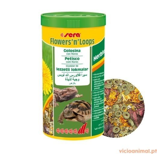 Sera Flowers’n’Loops é o petisco composto por uma mistura de flores secas (50 %) e anéis cuidadosamente processados, para tartarugas terrestres e outros répteis herbívoros.