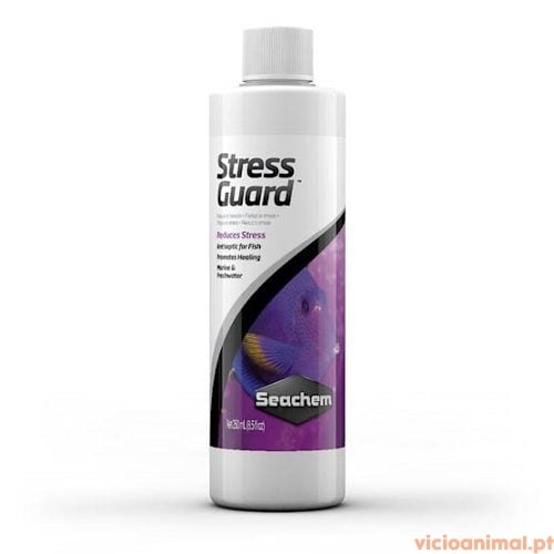 StressGuard da Seachem reduzirá o stress e a toxicidade da amónia sempre que manusear ou transportar peixes. O StressGuard liga-se à proteína exposta em feridas para promover a cicatrização de peixes feridos e reduzir a probabilidade de infecções primárias e secundárias. O StressGuard é compatível com todos os medicamentos, excepto aqueles que são à base de cobre.